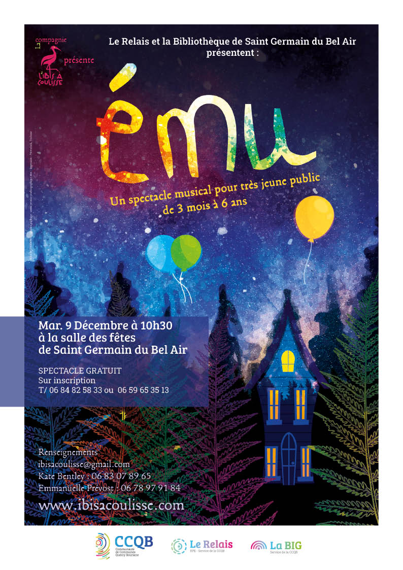 Pour fêter la fin de l'année, le Relais Petite Enfance et la Bibliothèque de Saint-Germain-du-Bel-Air proposent "Ému", un spectacle musical de la Cie l'Ibis à coulisses, pour les touts petits.